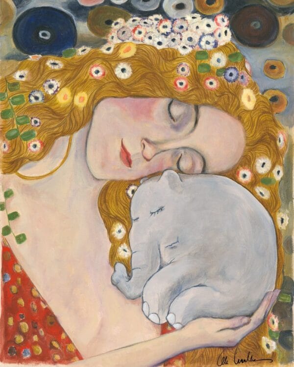 Auch die auf dem Kunstwerk abgebildete Dame und der kleine handschmeichelnde Ottifant scheinen ins Land der Träume gereist zu sein.