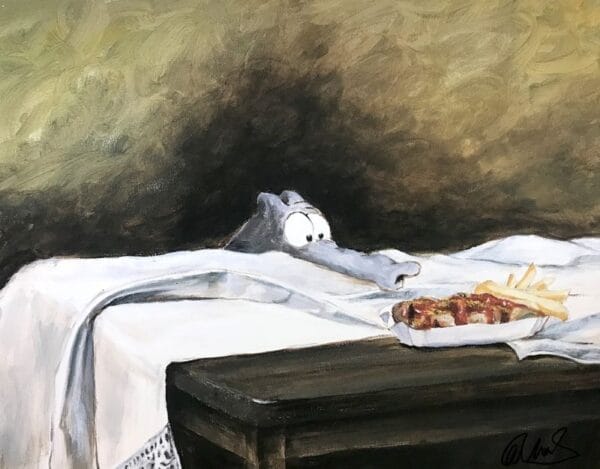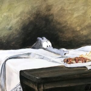 Frei nach Trübner „Dogge mit Wurstschüssel. Caesar am Rubikon“ (Jahr 1878)