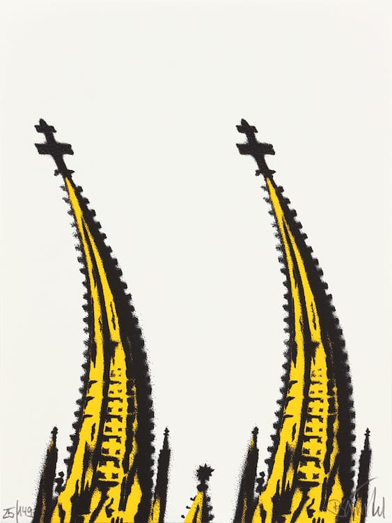Wir haben 2018 vier neue Editionen mit dem Künstler verlegt. Es handelt sich um kleinere Siebdrucke, die in der sehr ambitionierten Handsiebdruckerei in Berlin-Kreuzberg gedruckt wurden. Hier die Version „Schräger Dom“. Ungerahmt.