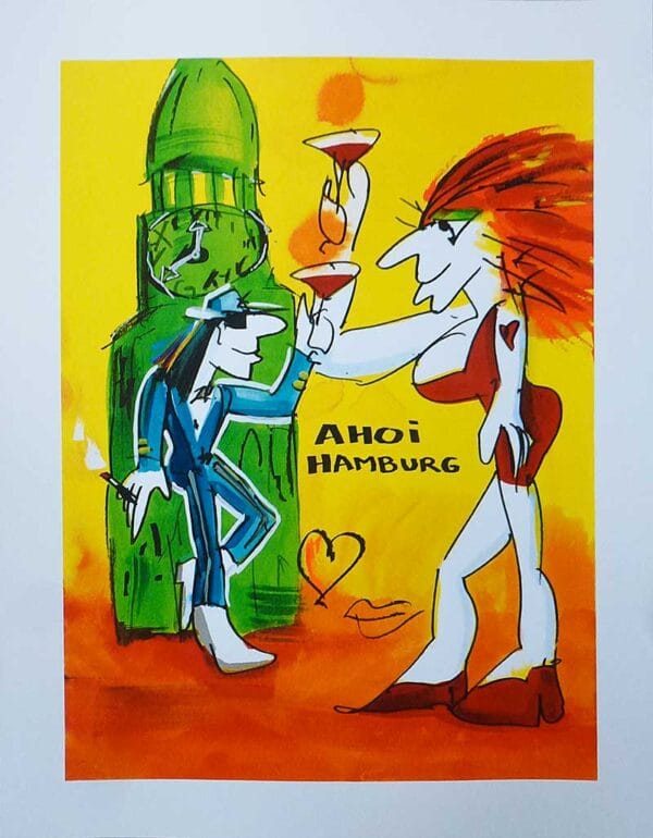 Ein Mann mit Hut und Sonnenbrille prostet vergnügt der weiblichen Begleitung zu. Gelassen lehnt er sich dabei an den Michel, das Wahrzeichen der Hansestadt. Ein salopp skizziertes Herz unterstreicht die visualisierte Liebeserklärung. „Ahoi Hamburg“ zeigt Udo Lindenberg in seinem Heimathafen. Seit über fünfzig Jahren lebt der vielseitige Künstler in der nordischen Metropole. Die Auftritte in der einstigen Szenekneipe Onkel Pö waren bedeutend für den musikalischen Durchbruch. Der Wohnsitz im Dachgeschoss des Luxushotels Atlantic an der Außenalster reflektiert seine kontroverse Persönlichkeit.