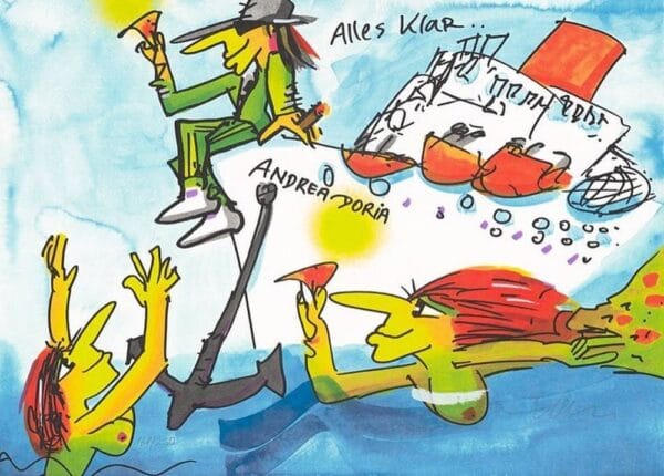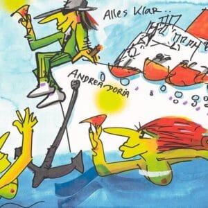 An Bord des Luxusschiffs genießt die illustre Gesellschaft das Leben. Mit von der Partie ist der Künstler. Ein Schriftzug verrät das Motto: „Alles klar auf der Andrea Doria„. Dabei handelt es sich um eine LP, die Lindenberg zusammen mit dem Panikorchester im Jahre 1973 veröffentlichte. Der Titelsong verhalf Lindenberg zum Durchbruch und stieß eine Karriere an, die Generationen spannt. 45 Jahre später brachte Lindenberg die Geschichte zu dem Lied mit seinem Andrea Doria Bild dann auch auf die Leinwand.