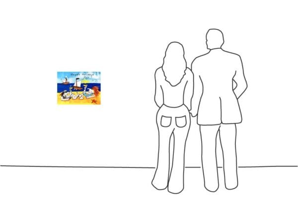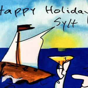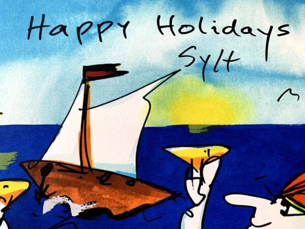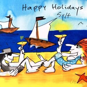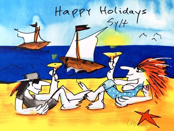 Udo Lindenberg liegt gemütlich mit einer reizenden Dame am Strand von Slyt. Beide trinken ein Glas Sekt und grinsen sich dabei in Ihre Gesichter. Im Hintergrund sind zwei kleinere Segelboote, sowie die Sonne zu entdecken, bei denen die Fahnen in zwei verschiedene Richtungen wehen. Dies beschreibt die spielerische Art des Künstlers auf den Punkt genau. Die grellen Töne und groben Farbverläufe geben dem Likörelle eine gewisse Tiefe. Die Möwen, welche unschwer zu erkennen sind, lassen den Bereich neben dem Bildtitel „Happy Holidays Sylt“ füllig wirken.
