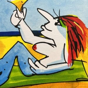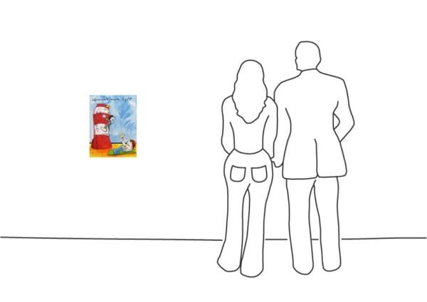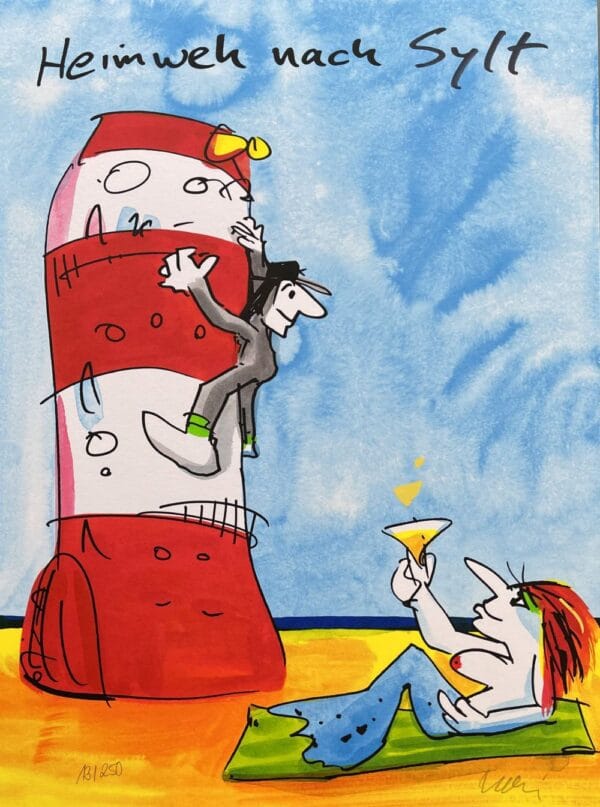 Dieses Gemälde „Heimweh nach Sylt“ von Udo Lindenberg beschreibt eine Szenerie, die auf der Insel Sylt stattfindet. Gut zu erkennen ist der für Lindenberg typische Malstil, der mit bunten Farben vollendet wird. Erhältlich ist das Kunstwerk ist es in drei verschiedenen Rahmungsvarianten, mit silbernem Holzrahmen und weißem Passepartout und Floatglas, mit einem Rahmen aus Aluminium mit Zwischenleiste, weißem Passepartout und Floatglas oder schwebend aufgeblockt in einem silbernem Alurahmen von Nielsen. Selbstverständlich verfügt das Werk ein Echtheitszertifikat mit Hologramm.