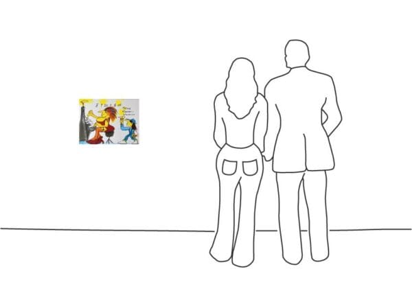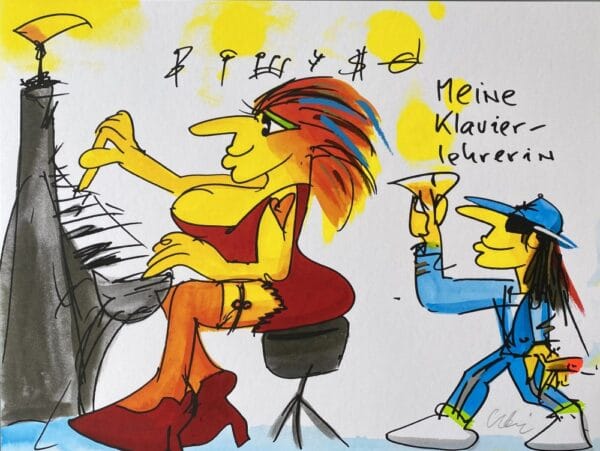 Für das Kunstwerk „Meine Klavierlehrerin“ wurde als Technik der Siebdruck verwendet. Das Motiv lehnt an seinem Lied „Die Klavierlehrerin“ aus dem Album „Panik mit Hut“ an. Am Bild selbst, stellt sich Udo Lindenberg ganz typisch im blauen Kapitänsanzug mit Drink und Zigarette dar. Vervollständigt werden seine Bilder gerne mit einem kleinen Zitat oder ähnlichem. Bei dem Kunstwerk „Meine Klavierlehrerin“ handelt es sich um ein Original, welches von ihm handsigniert wurde. Es gibt Motive die Lindenberg öfter malt, doch immer von Hand und jedes Kunstwerk unterscheidet sich in Komposition und Farbe.
