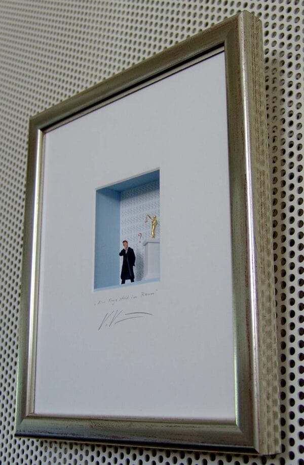 Hier sehen Sie eine typische Einrahmung der Bilder von Volker Kühn: Es handelt sich um eine silberne Holzleiste, weißem säurefreien Passepartout mit Floatglas, wobei die Werke von Herrn Kühn auch mit schwarzem Rahmen geordert werden können!