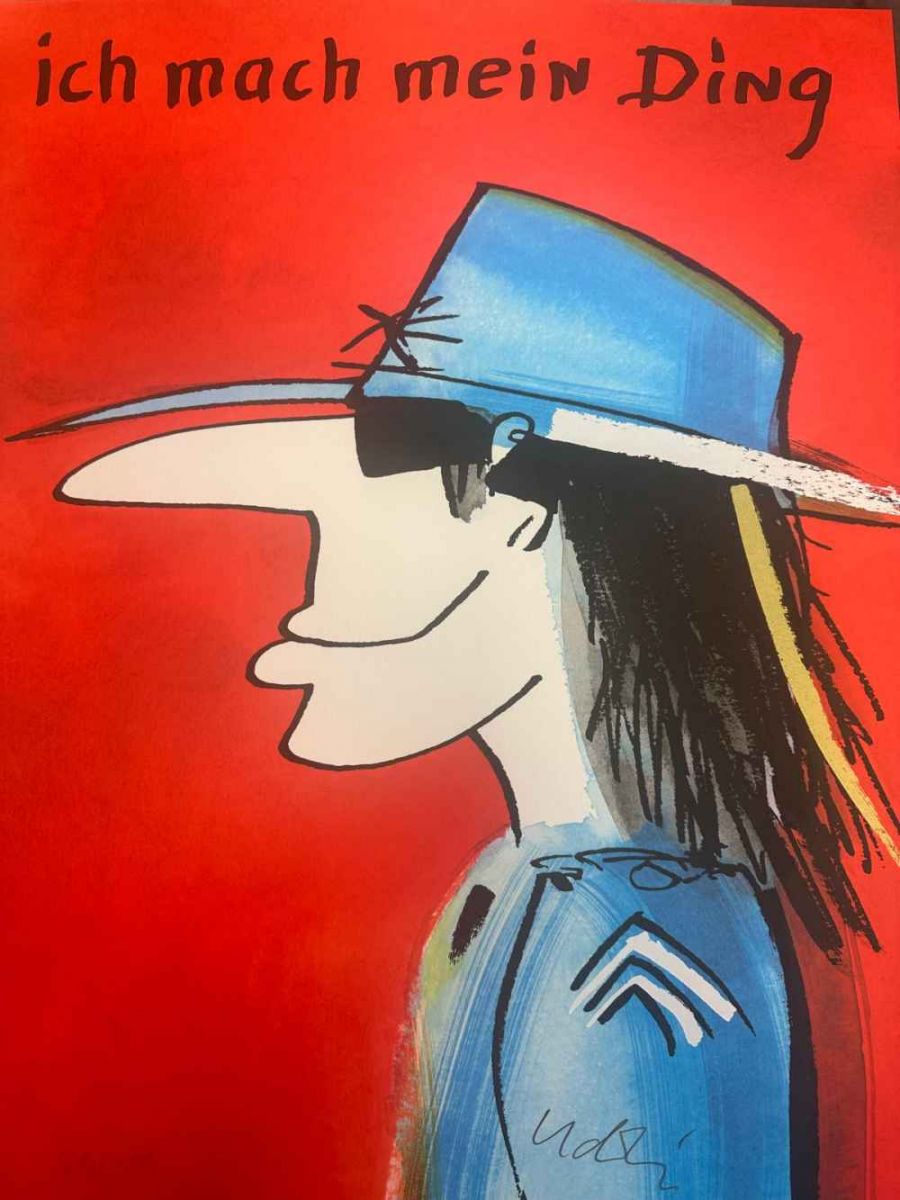 Dieses ausdrucksstarke Werk von Udo Lindenberg vereint die unverkennbare Handschrift des Künstlers mit seiner rebellischen Lebensphilosophie. "Ich mach mein Ding" – ein Motto, das sowohl Lindenbergs musikalisches als auch künstlerisches Schaffen prägt – spiegelt sich hier in einem stilisierten Selbstporträt wider.